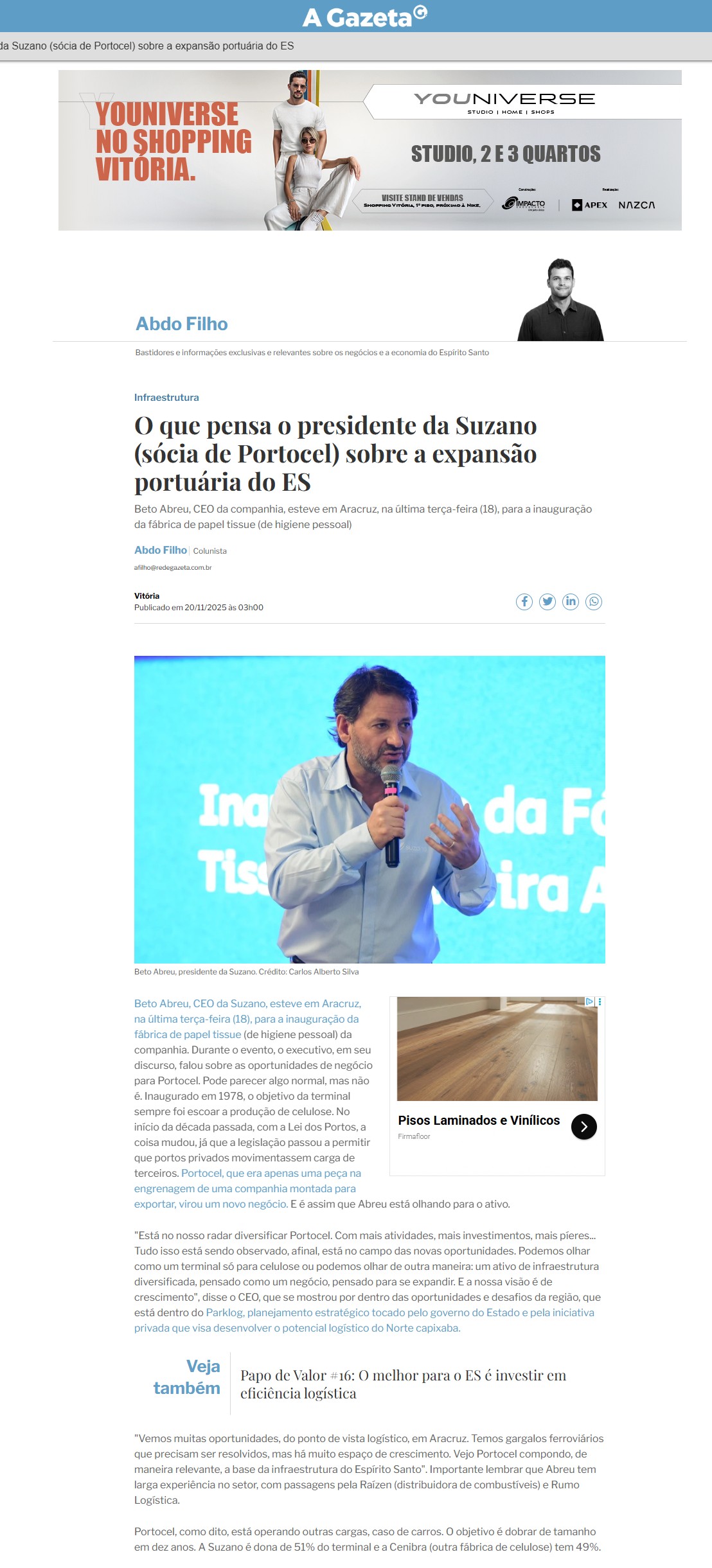 O que pensa o presidente da Suzano (sócia de Portocel) sobre a expansão portuária do ES