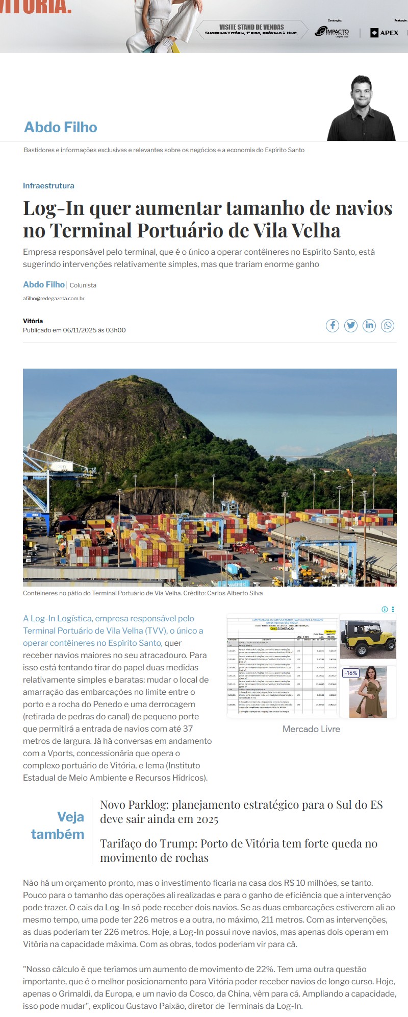 Publicado em www.agazeta.com.br/colunas/abdo-filho/log-in-quer-aumentar-tamanho-de-navios-no-terminal-portuario-de-vila-velha-1125