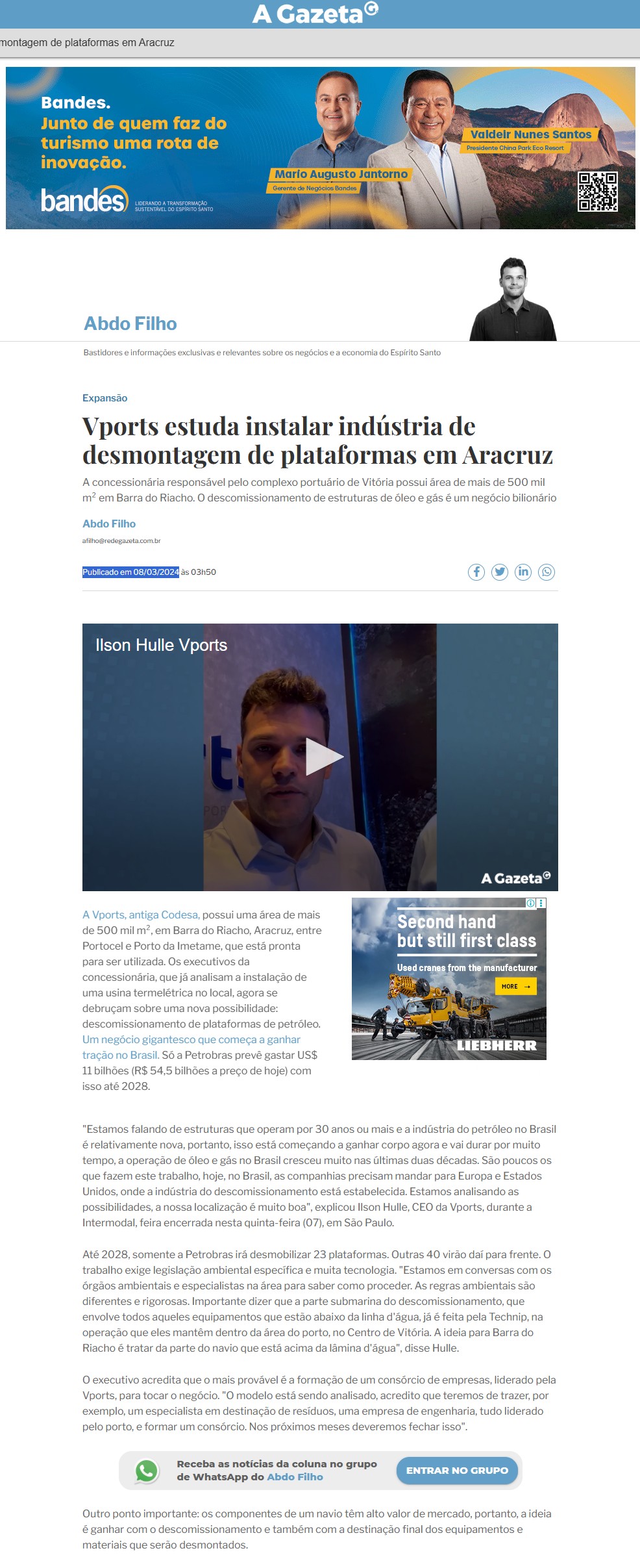 Publicado em https://www.agazeta.com.br/colunas/abdo-filho/vports-estuda-instalar-industria-de-desmontagem-de-plataformas-em-aracruz-0324